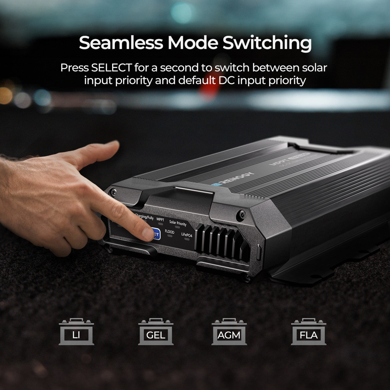Effortlessly switch between solar and DC inputs to keep your battery charged efficiently, all while enjoying the reliability and superior performance you expect.